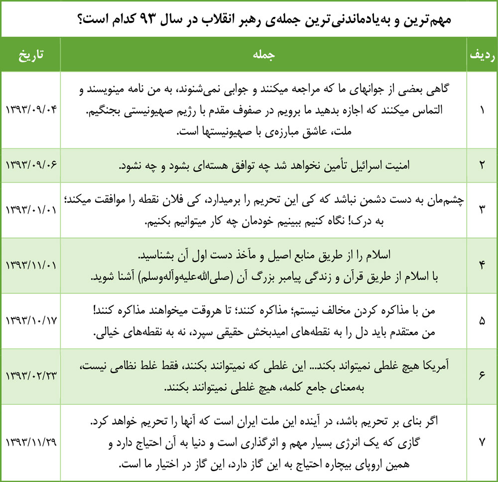 چندی پیش پایگاه اطلاعرسانی دفتر حفظ و نشر آثار مقام معظم رهبری، از مخاطبان خود خواست مهمترین و بهیادماندنیترین جمله امام خامنهای در سال ۱۳۹۳ را انتخاب و آن را مشخص کنند. این نظر سنجی تا ۲۶ اسفند ماه ادامه داشت.